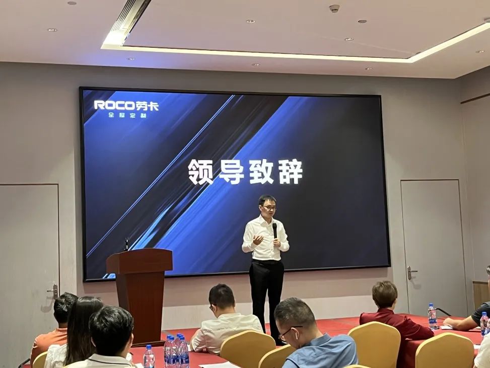 在喻总致辞完毕后,劳卡定制家居事业部总经理江辰先生对劳卡核心优势进行了分享,全方位阐述了劳卡在企业规模、品牌影响力、产品矩阵、研发实力等方面所具备的独特品牌优势,让大家对劳卡有了更清晰的认识。他提到,在品牌制胜的时代,加盟大品牌意味着稳定与商机。尤其是劳卡1+N运营模式,在深厚的品牌底蕴加持下,成熟的产品品质、领先的研发与创新能力,加上营销赋能,运筹帷幄,驰骋市场,能够帮助劳卡经销商在未来的经营中保持不败之地。