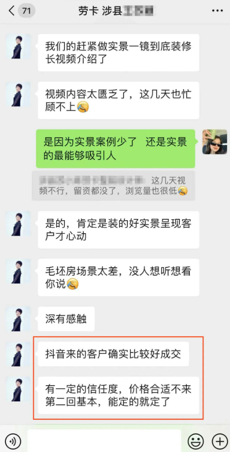 深知现在的线下获客效率和效果都明显下降了很多 ,所以涉县门店一直都很注重渠道积极攻克流量难题,其中抖音就是她们一直非常重视的一个渠道。之前参与总部直播项目的时候,客资质量都挺不错的,成交率很高,所以那时起她们店面就配置了专门的线上渠道人员,实现线上客资线下成交闭环。