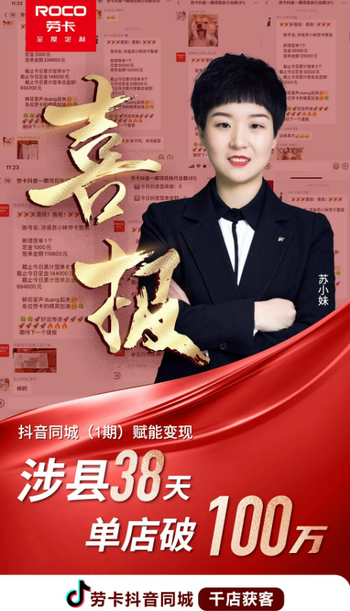 今天跟大家分享的劳卡抖音同城赋能的标杆案例,她是一位在涉县做全屋定制的90后,她清楚的明白渠道很重要,所以看到了抖音的红利,但是刚开始拍短视频,不知道说什么、拍什么,选题、主题都没方向,拍了好多视频,质量和播放量都不怎么好,也很难变现。始终觉得自己没有打开抖音的流量密码,没有挖掘到里面的精髓。