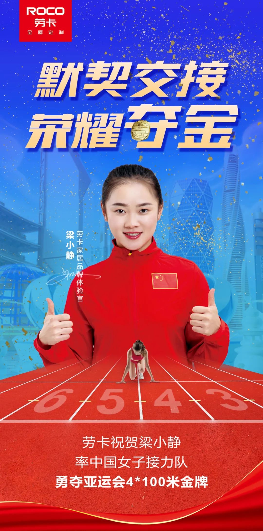作为国内短跑名将的梁小静,曾获得国内外多次单项、接力赛冠军,今年7月的亚锦赛上,梁小静就率队获得女子4x100米接力赛的冠军,本次亚运会也是势在必得。据悉,本次梁小静是带伤出战,“我上场的时候就和教练说,我的腿真的绑得快出血了,我真的害怕我跑不下来”。梁小静在赛后接受采访时说到。梁小静这种勇往无前、坚韧执着和保持专注的精神气质,与劳卡的品牌形象高度契合。作为定制之都示范企业,劳卡19年来专注于全屋定制领域,执着于产品品质,持续奋斗,已发展成行业的中坚力量。