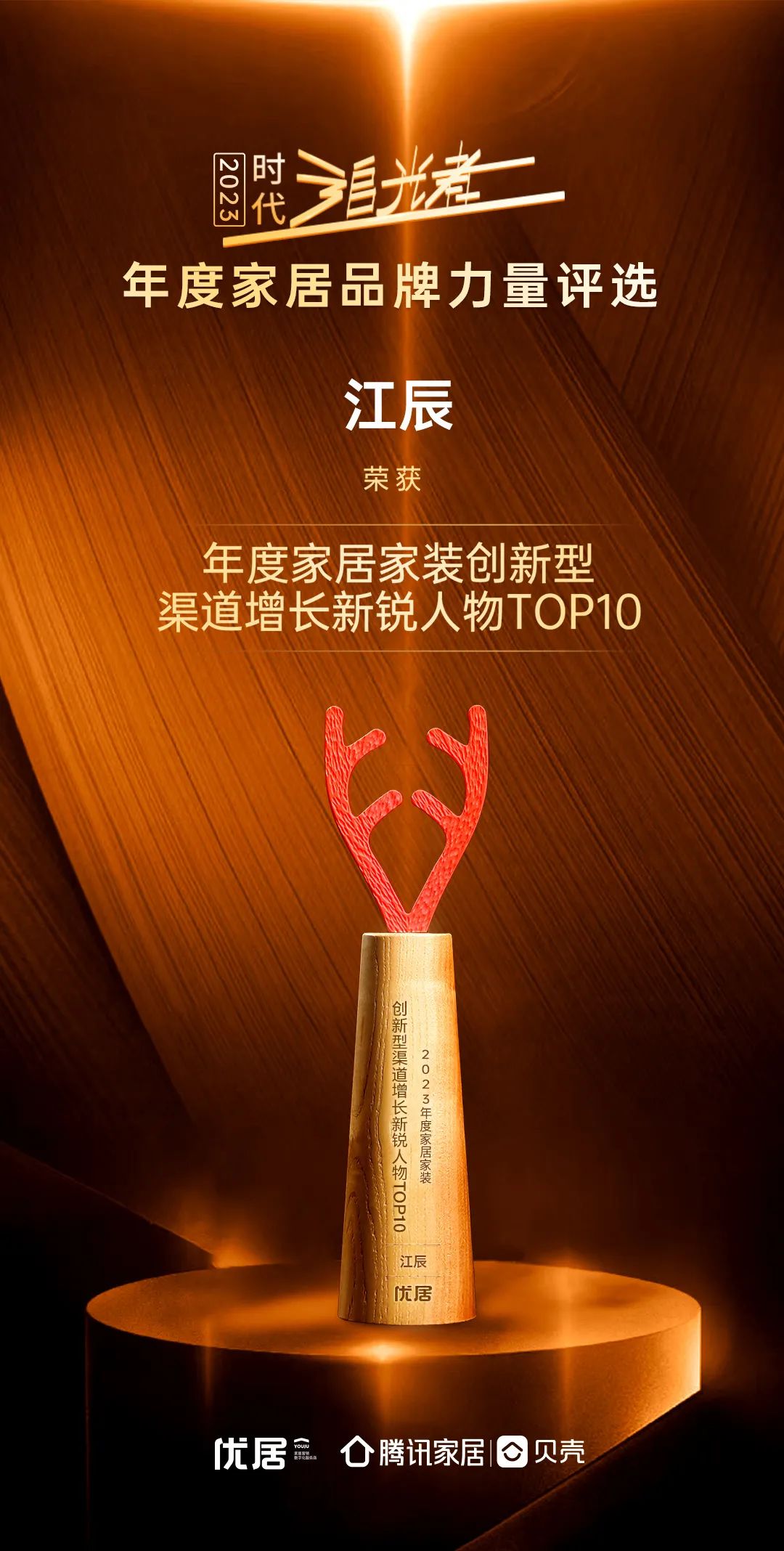 劳卡定制家居事业部总经理江辰更是因其在当下多变、挑战重重的局势中,以创新的方式通过抖音同城渠道取得显著成就,打开劳卡线上获客新局面,为企业带来突破性增长,同时也推动了行业的创新发展,荣获“2023年度家居家装创新型渠道增长新锐人物TOP10”。