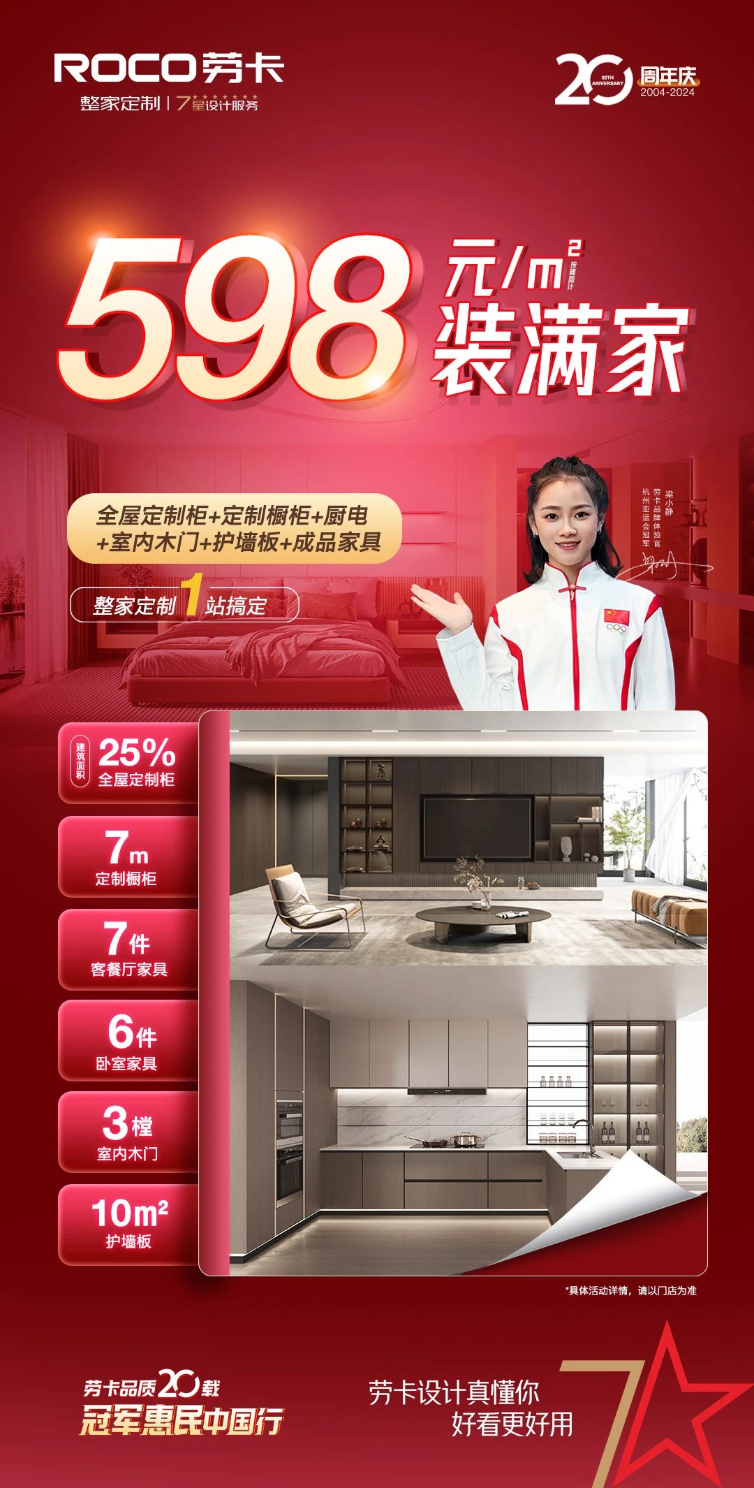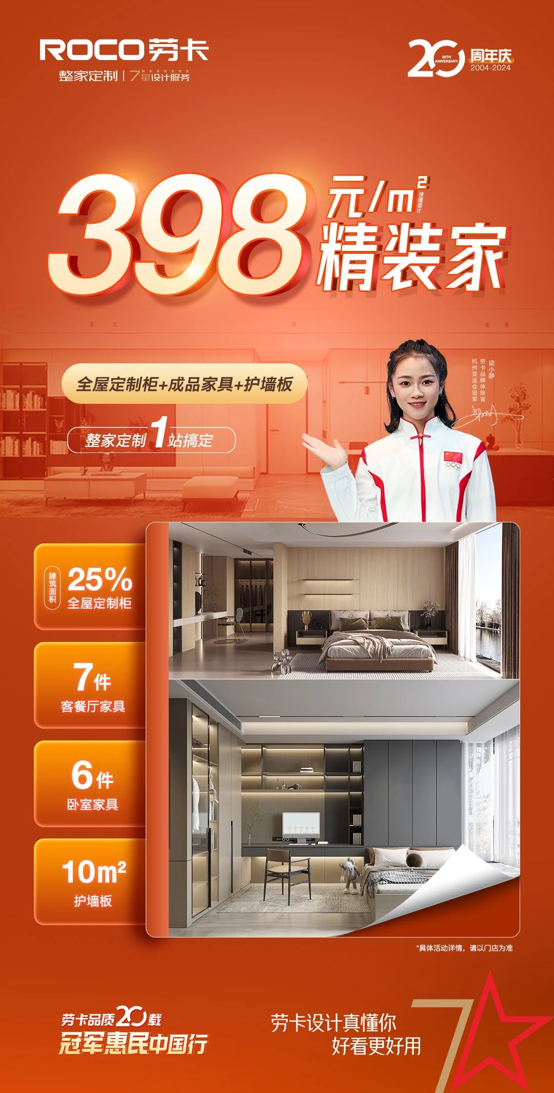 作为全球定制之都(广州)示范企业,劳卡积极响应国家号召,在普惠政策指引下率先出击,携手世界冠军梁小静举办“劳卡品质20载·冠军惠民中国行”全国联动活动,重磅发布398元/㎡惠民精装套餐和598元/㎡惠民毛坯套餐,开启“金九银十”的家居消费惠民风暴,通过总部让利,以高品质、价格实惠的产品 ,助力消费者焕新美好生活。