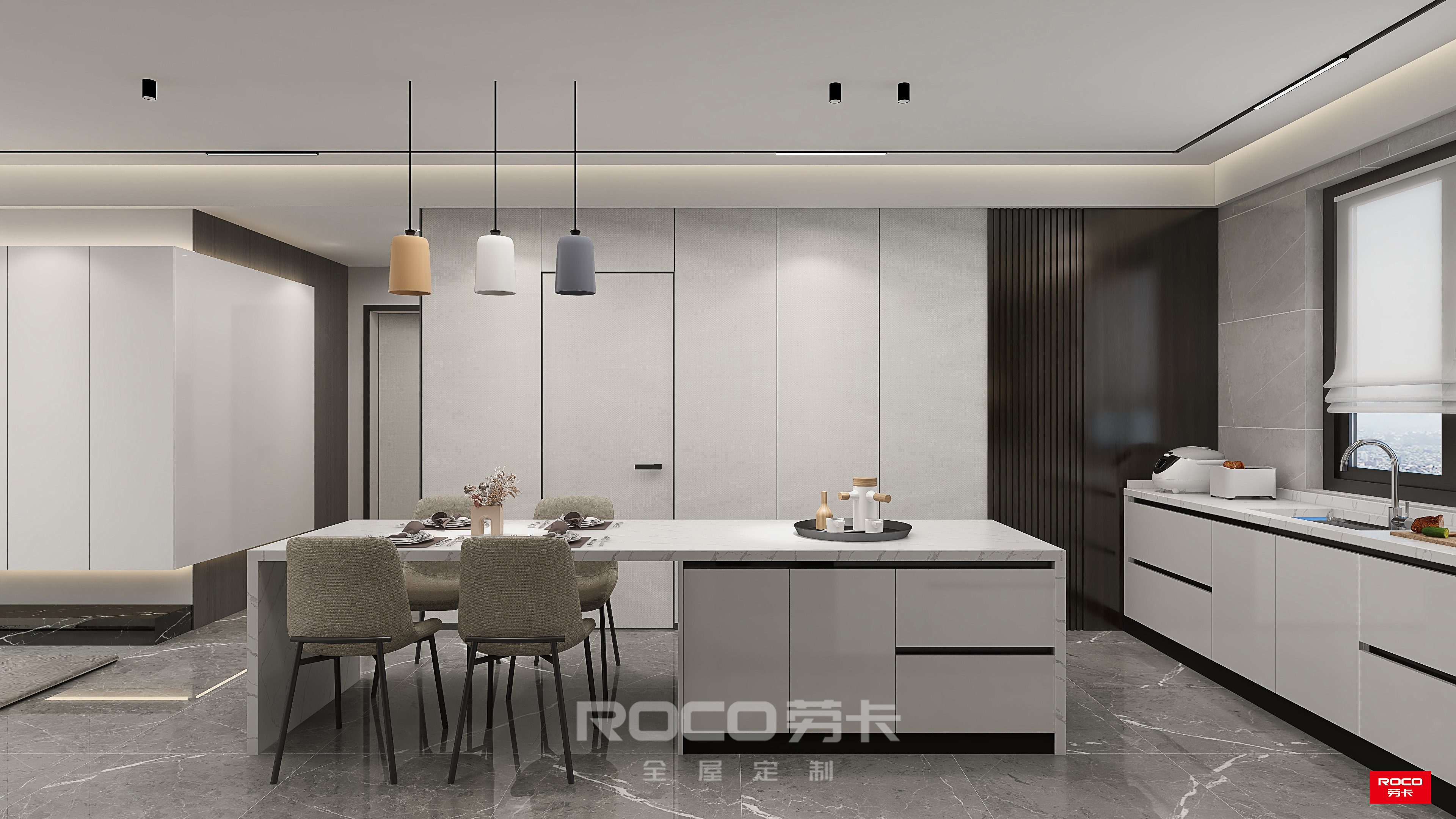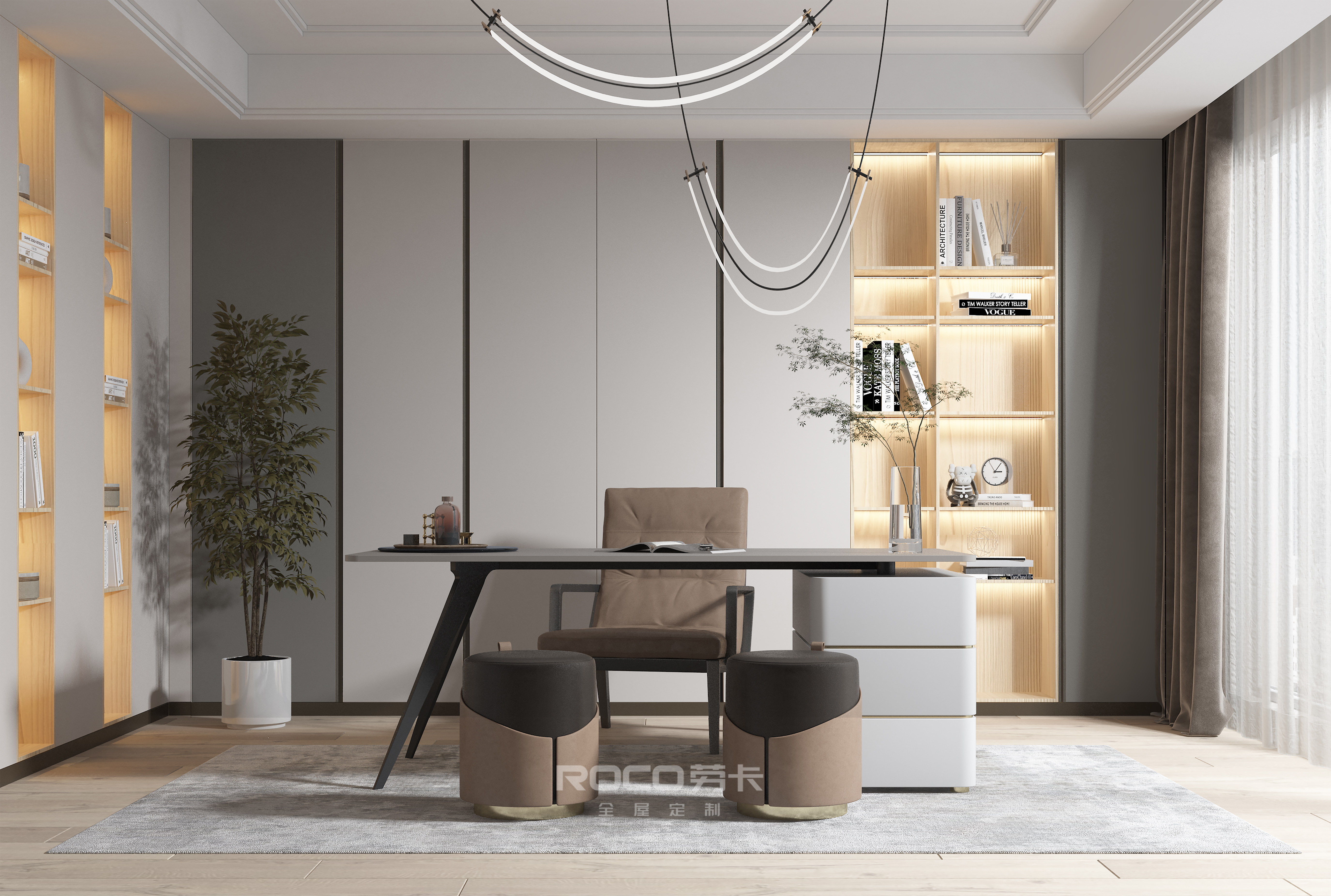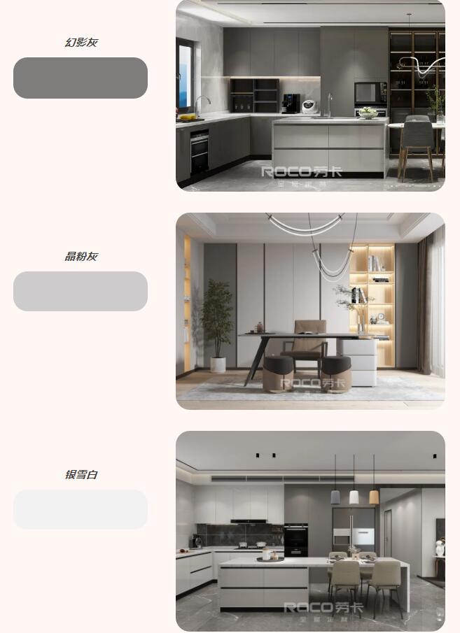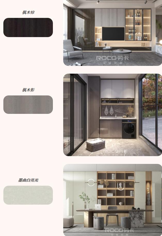 劳卡全屋定制本次新推出的极简主义V4系列轻奢版的三款UV亮光门板花色,是劳卡自主开发的专属花色,表面带有独特的花纹——枫木表面疏密有致的木纹纹理,打造家居的自然之感;墨曲白虚虚实实的山水纹,延绵流长,营造出一副山水意境,造就雅致的诗意生活。UV亮光门板的三款新花色打破了纯色亮光门板的单调枯燥,为家装设计提供了更多可能性,让搭配更独特、更具层次、更富有美感。