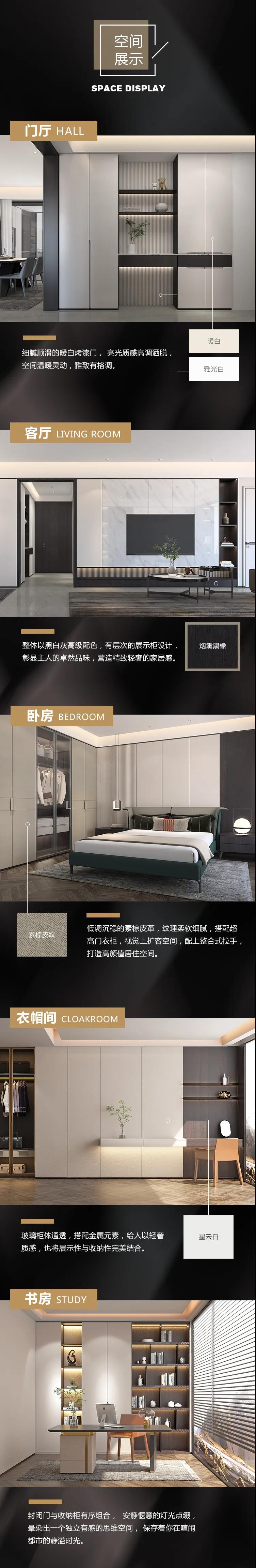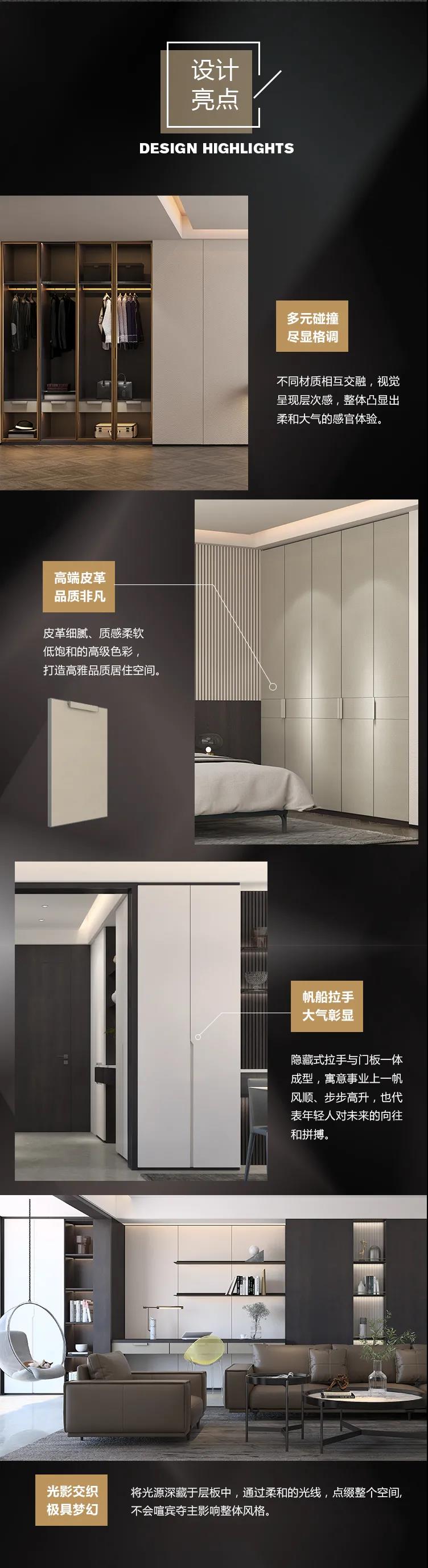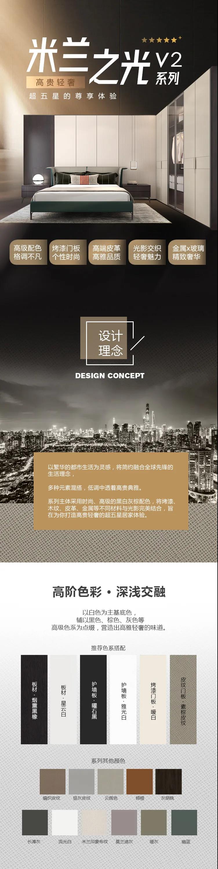 以繁华的都市生活为灵感,将简约融合全球先锋的生活理念,多种元素混搭,低调中透着高贵典雅。系列主体采用时尚、高级的黑白灰棕配色,将烤漆、木纹、皮 革、金属等不同质感,与光影完美结合,旨在打造高贵轻奢的超五星居家体验。