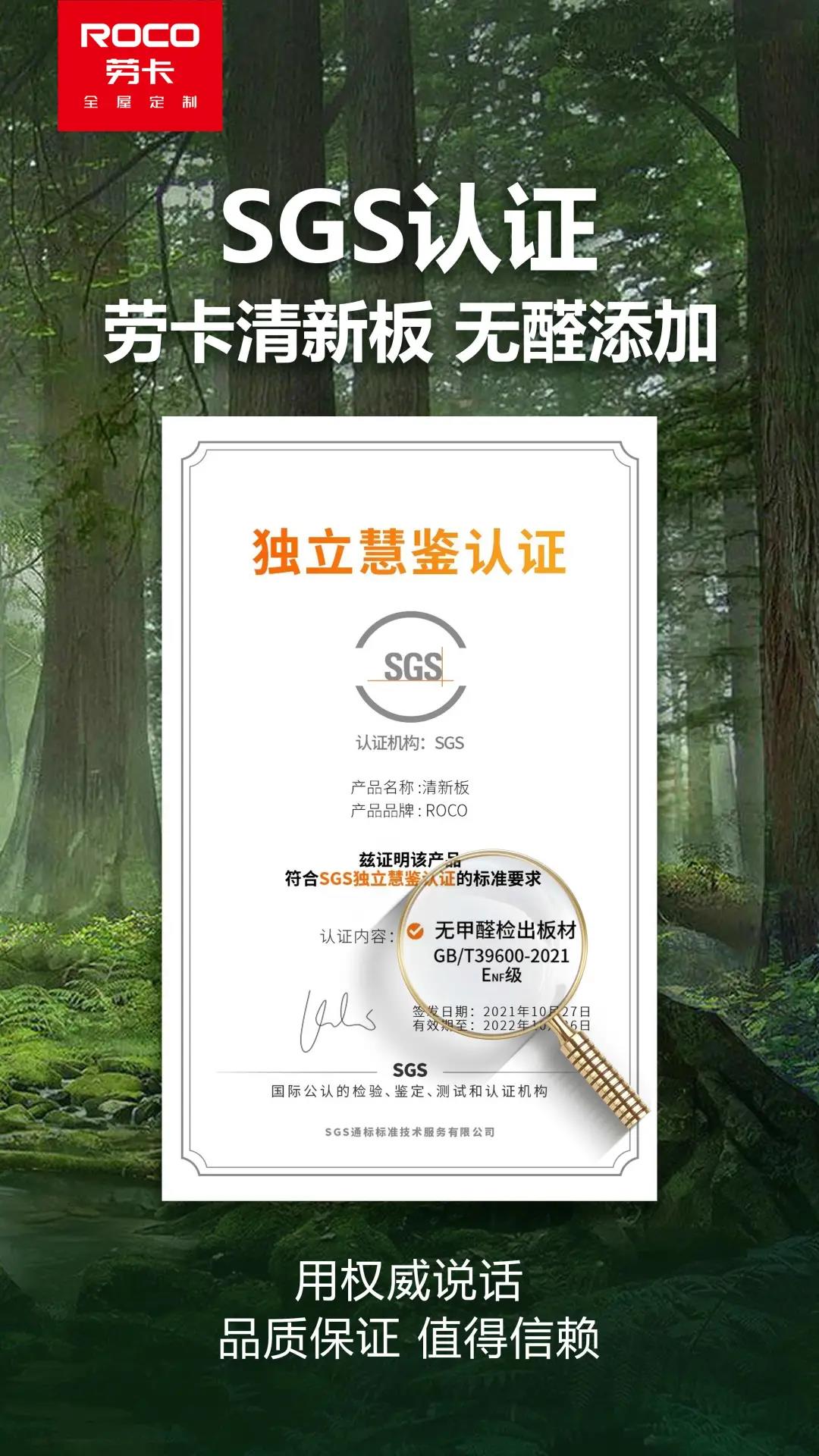 劳卡清新板,通过严格检测,并获得SGS独立慧鉴认证,甲醛释放量为“未检出”(MDL检测限值为0.015mg/m³),按照新国标GB/T 39600-2021,ENF级标准为≤0.025mg/m³,劳卡清新板大大优于ENF级标准,表明了劳卡对板材环保健康的高度重视,助推劳卡迈入又一个新巅峰!