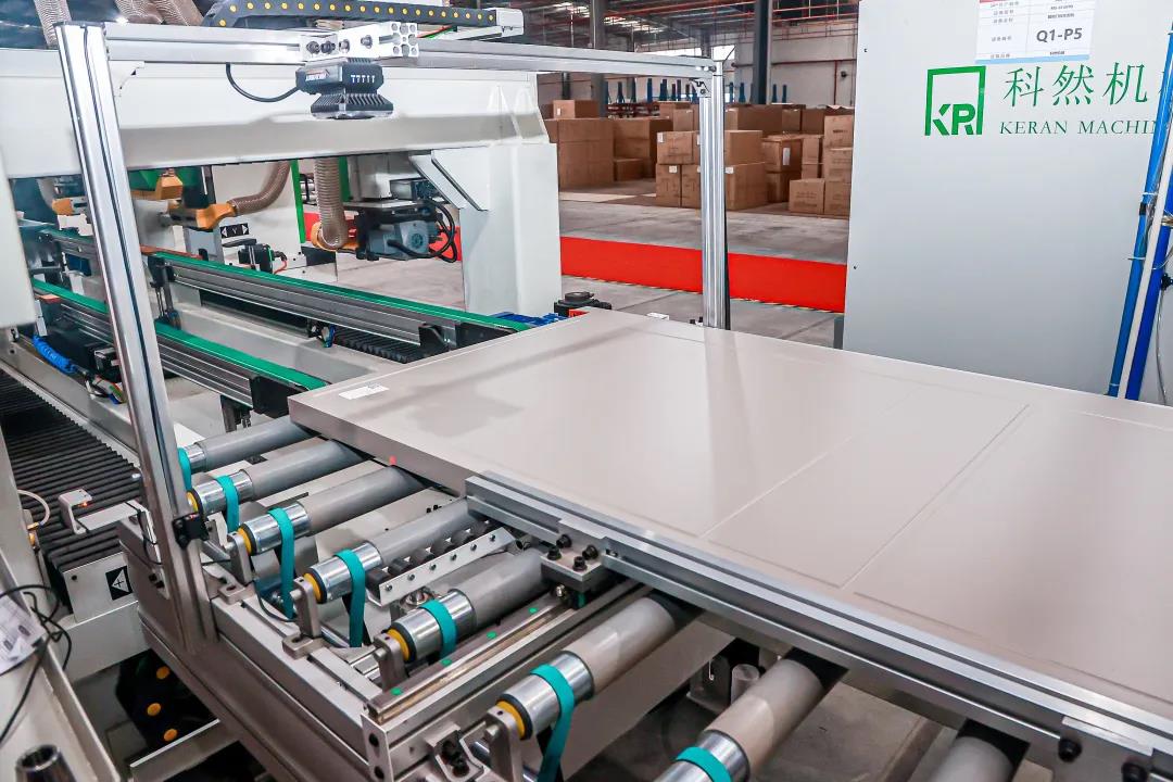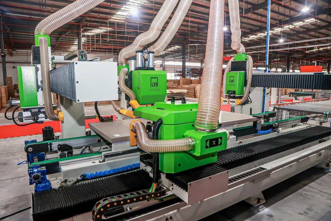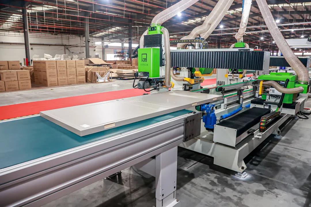 如此高效的生产效率,得益于产线高度数字化的发展,从开料、包装到运输交付,均为智能先进数控设备,并拥有数控雕刻机、高精度电子锯、微波压机、自动化四边锯等诸多行业先进设备。除此之外,整条产线还细化布局和工位设计,充分考虑了安全、高效等操作方式,实现产品标准化生产。