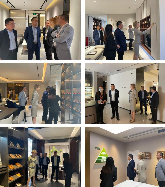 随后,月星家居欧总一行参观劳卡轻奢馆,在参观了解过程中,用心聆听讲解人员对展厅空间的介绍,细心感受每一处产品细节,并对劳卡的生产工艺、创新设计、环保等级等方面进行了详细了解和深入交流,对劳卡线下终端门店的展示和体验赞叹不已。