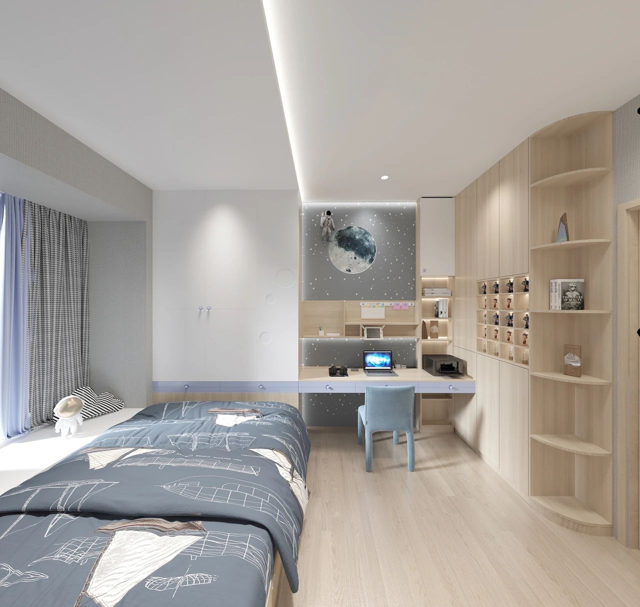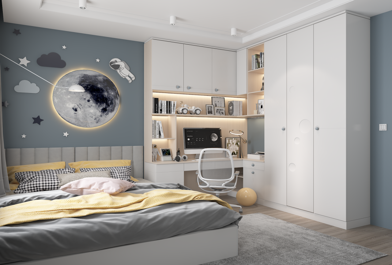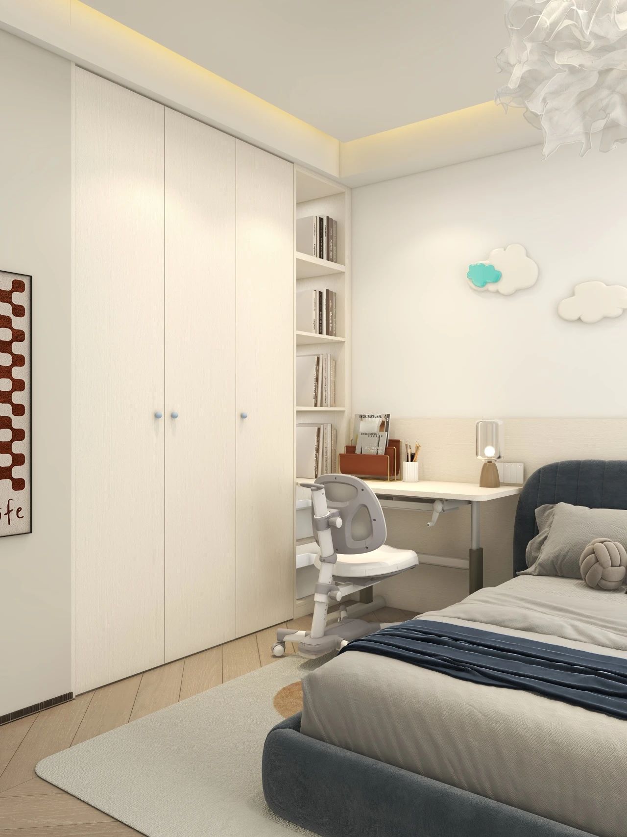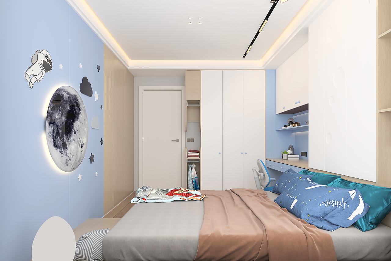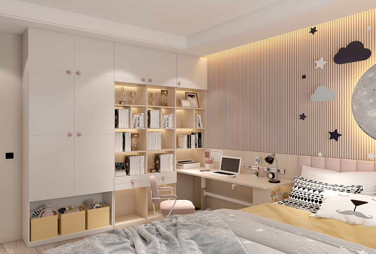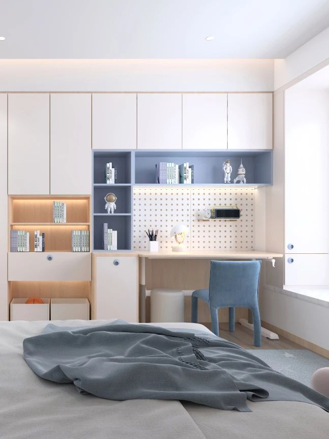 等孩子读中学以后,学业压力进一步增加,书本也越来越多,这时候一定要规划好儿童房的收纳区,保证视觉上的清爽感。