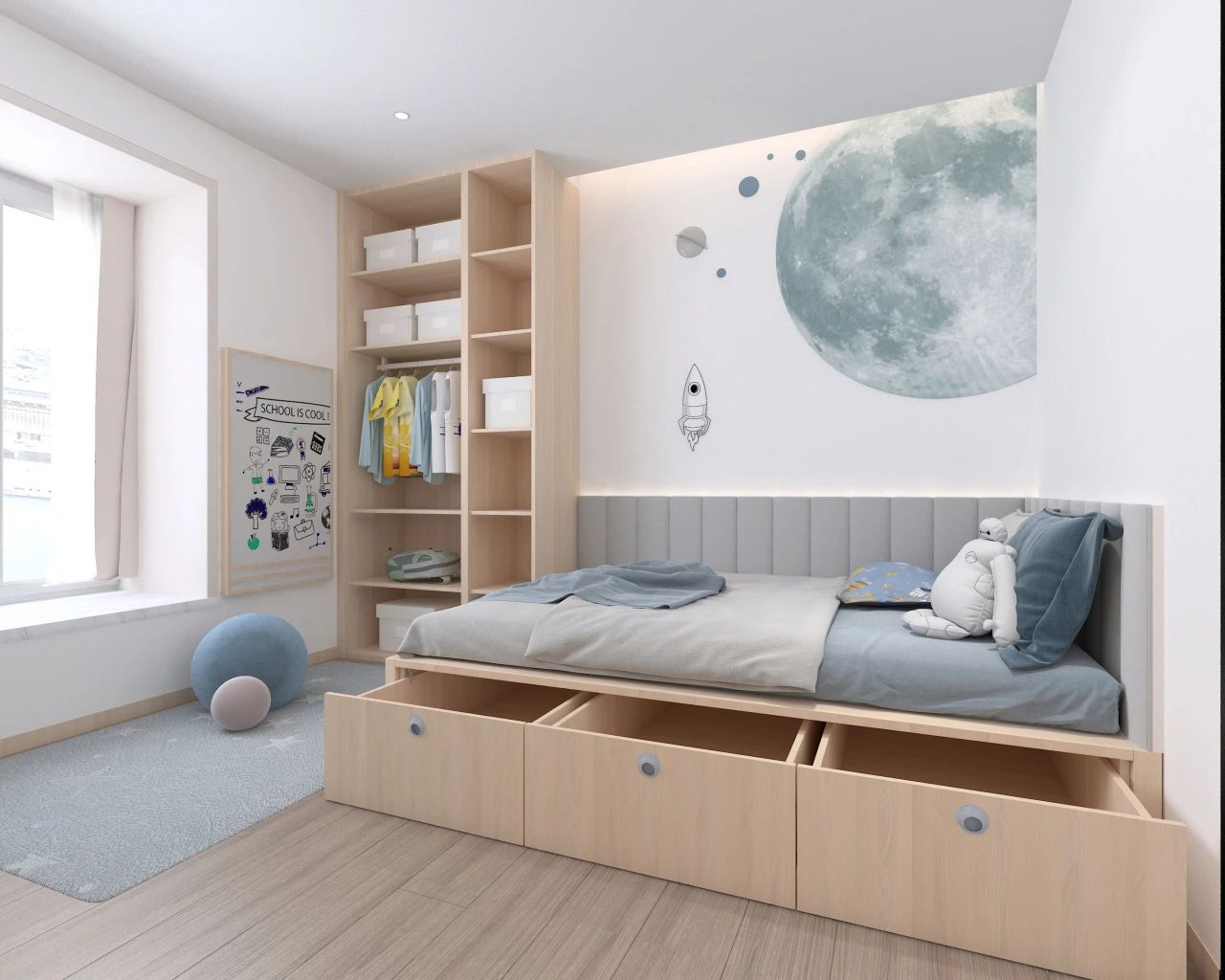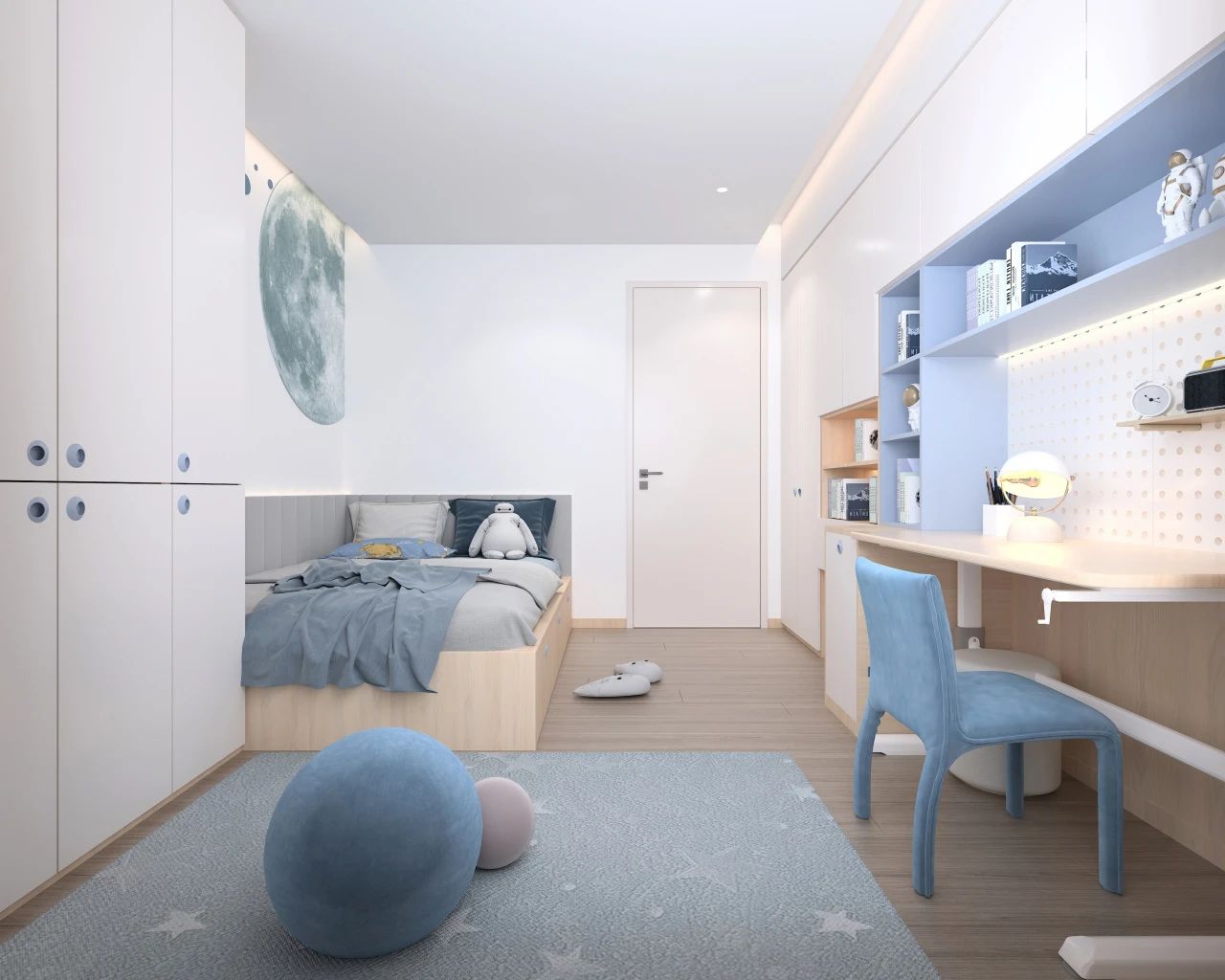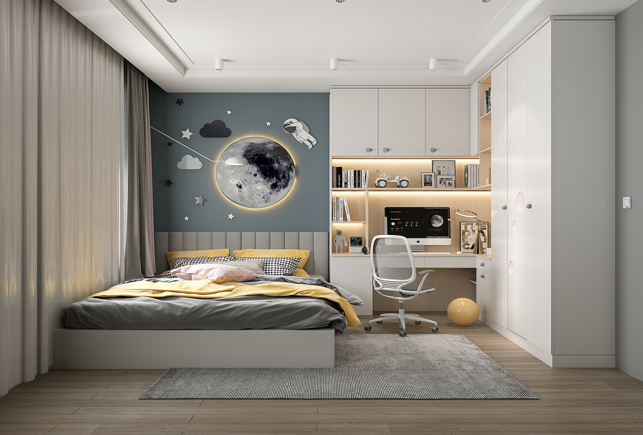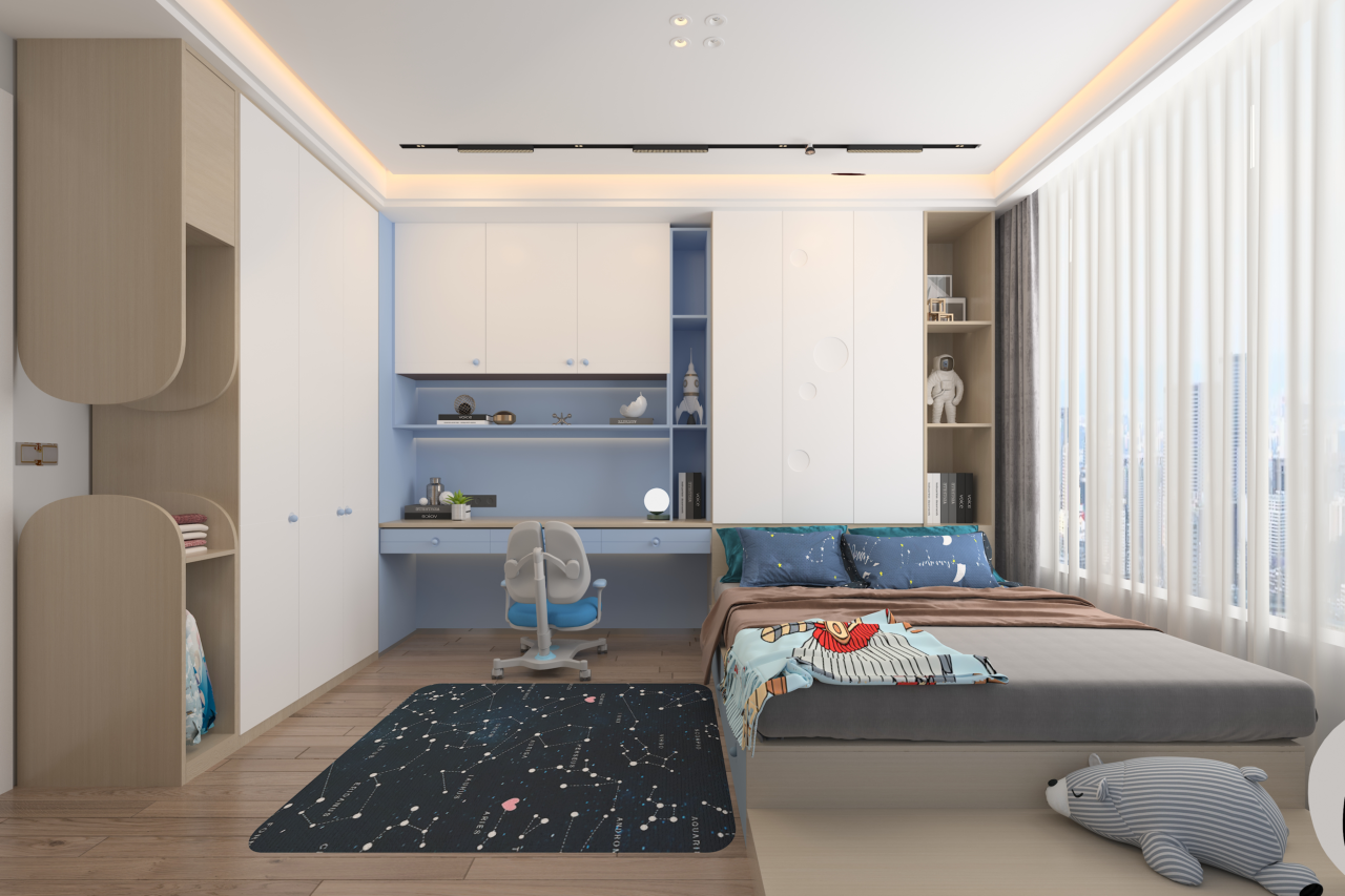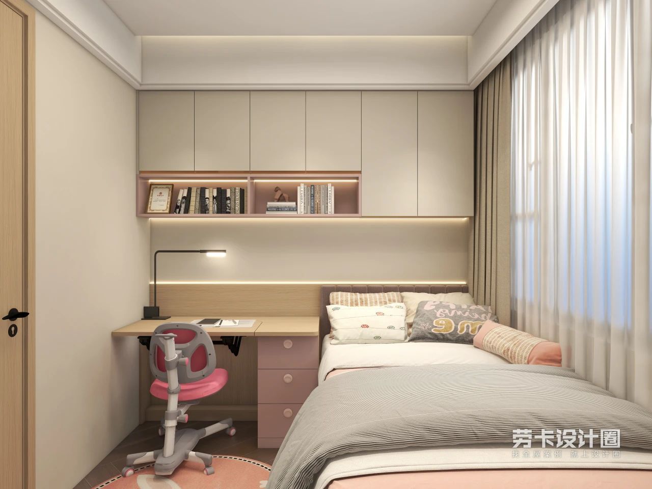 等孩子读中学以后,学业压力进一步增加,书本也越来越多,这时候一定要规划好儿童房的收纳区,保证视觉上的清爽感。
