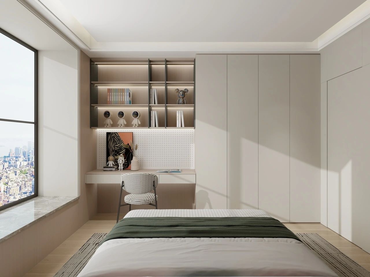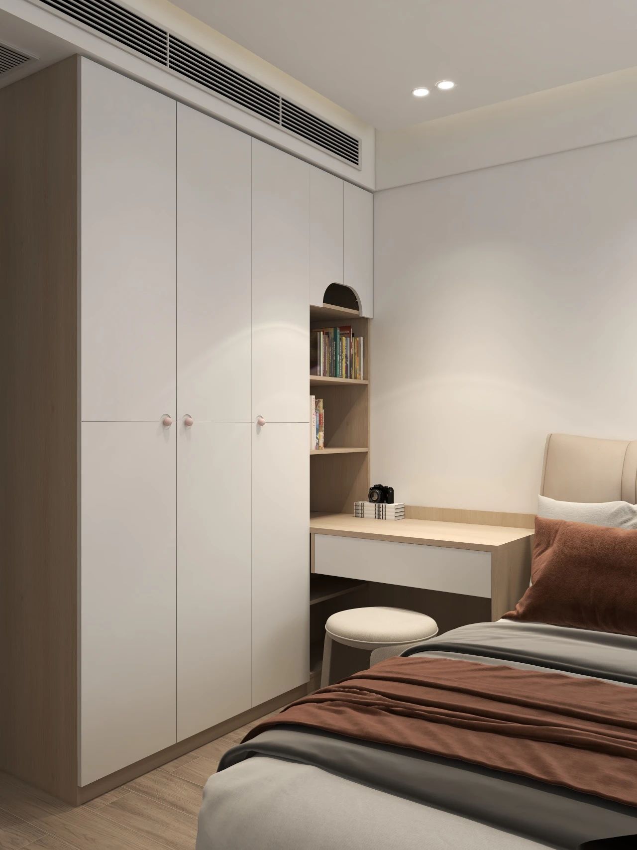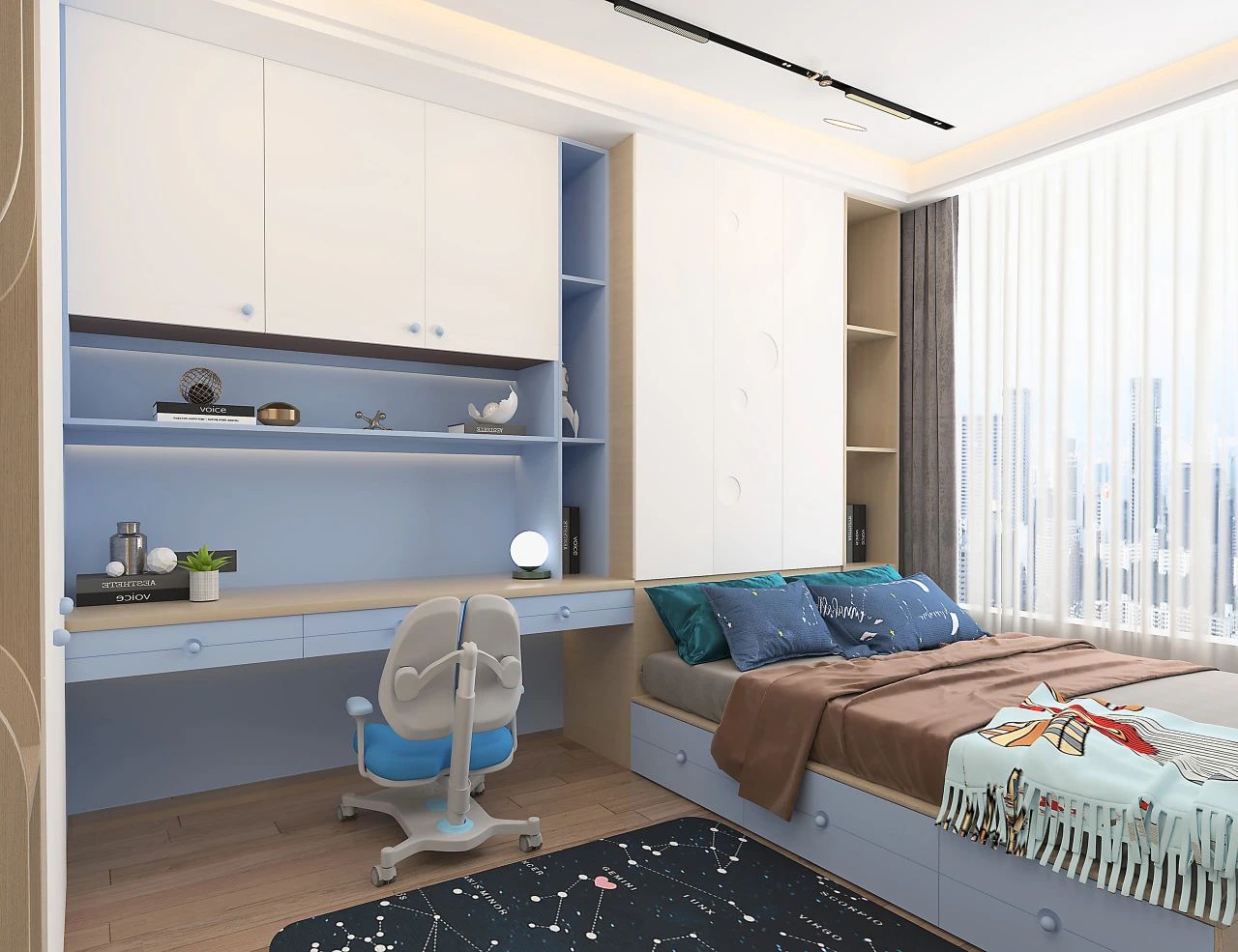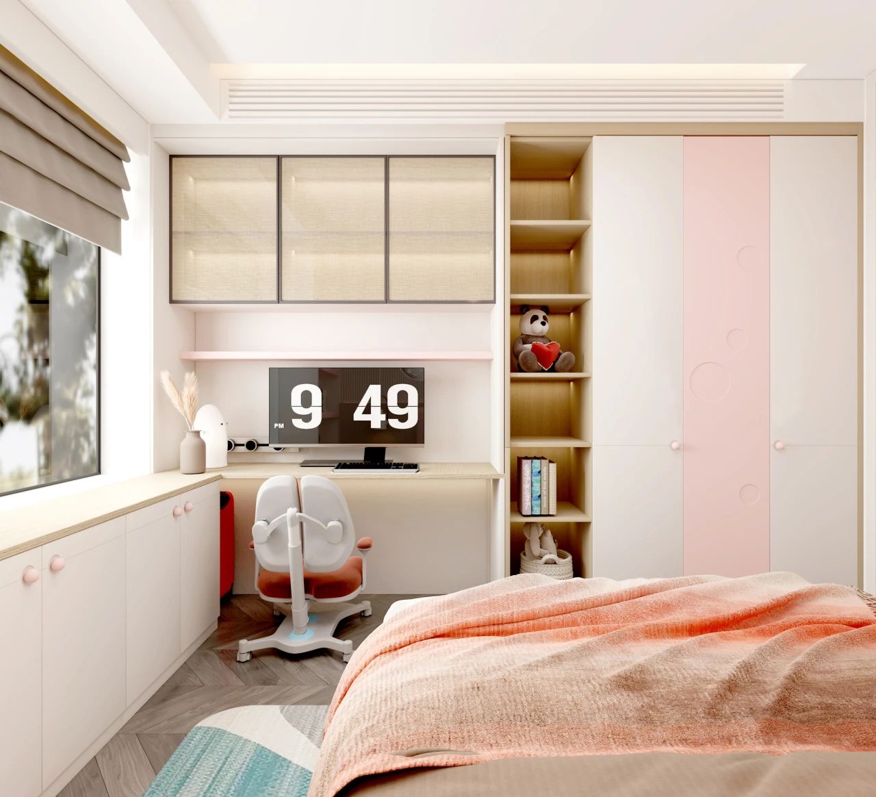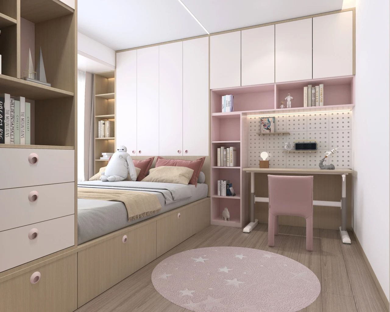 等孩子读中学以后,学业压力进一步增加,书本也越来越多,这时候一定要规划好儿童房的收纳区,保证视觉上的清爽感。