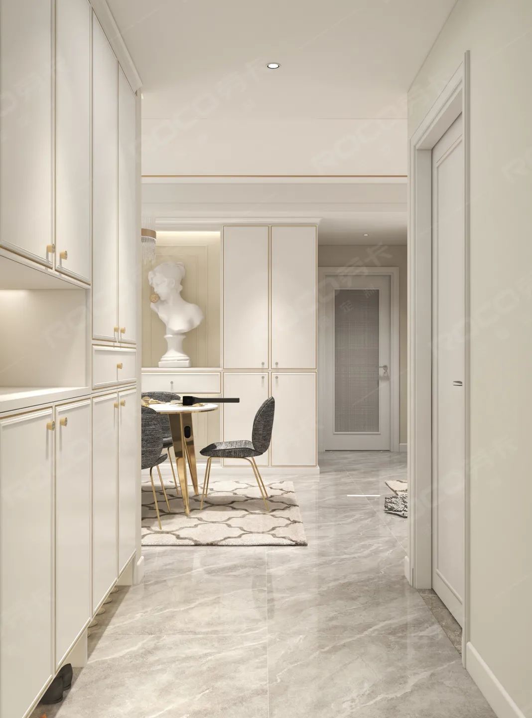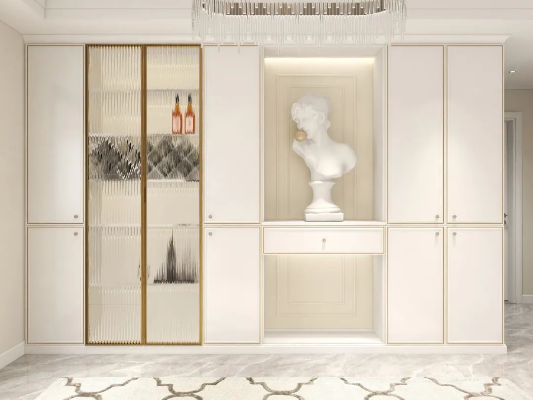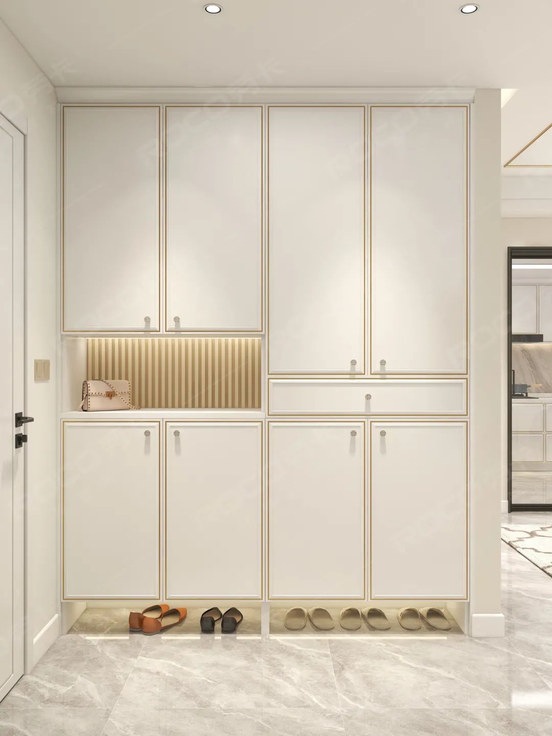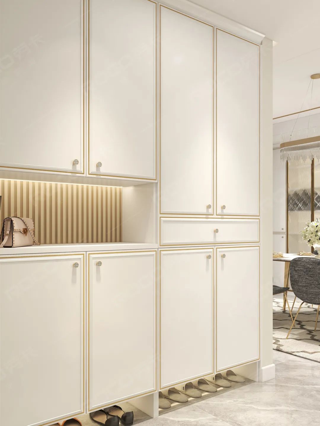 整体采用珍珠白花色,细致的嵌边金属线框门板,极致轻奢。到顶式设计,满满的储物空间,用于换鞋和收纳出入时的随身物品。