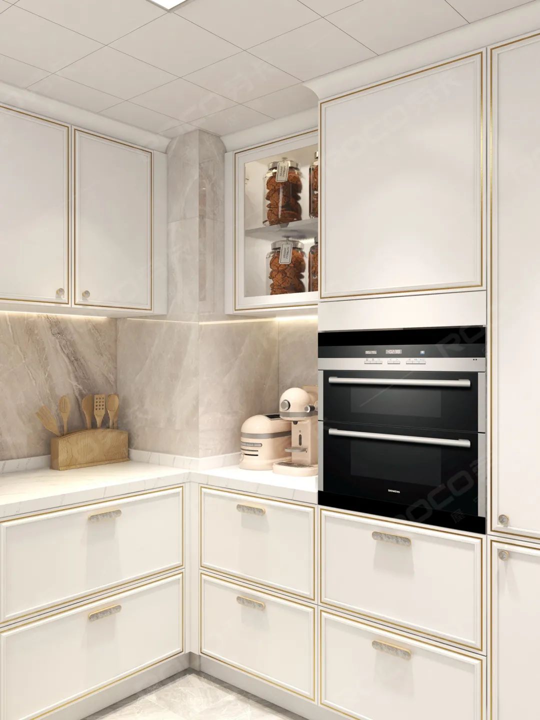 U型布局的橱柜,让厨房空间利用得淋淋尽致。柴米油盐酱醋茶,@嘉悦生活的点点滴滴都在这里出发。