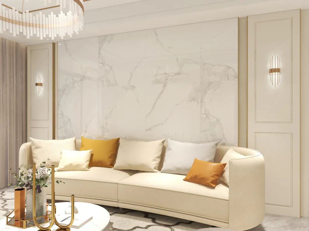 电视柜只定制了一个简约的地柜,在视觉上给人轻盈的现代感。背景墙融入大理石纹理,增添别致的层次感。