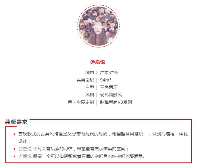 经过多次的沟通,了解到@嘉悦想要拥有高级优雅时尚的舒适居家空间,现代简欧风的风格是她最心属的,这样独特的高级感与劳卡魅雅新尚V3系列不谋而合,那么设计师是怎样体现的呢?我们继续看下去吧!