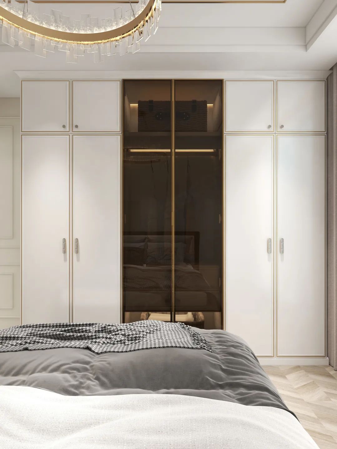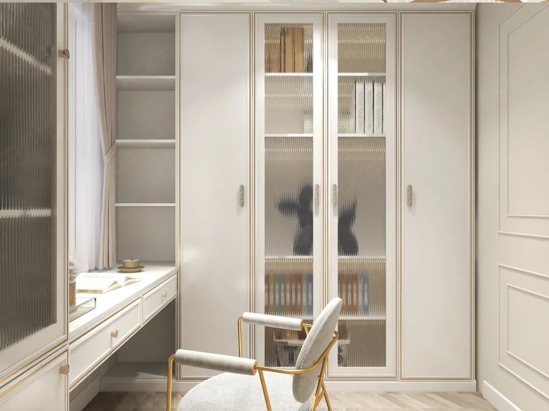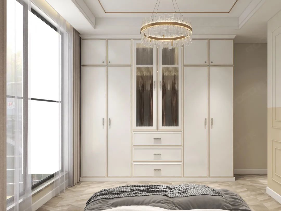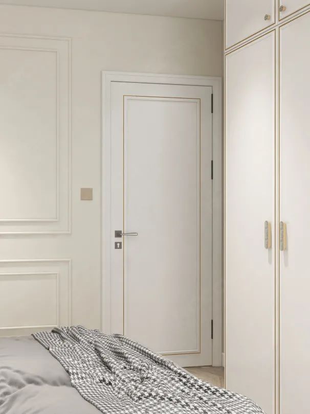 房门也做出了别致的设计,与墙柜的风格一体,简约欧式的线条,不仅彰显@嘉悦品味,同时也让主卧整体的调性呈现更加完美。
