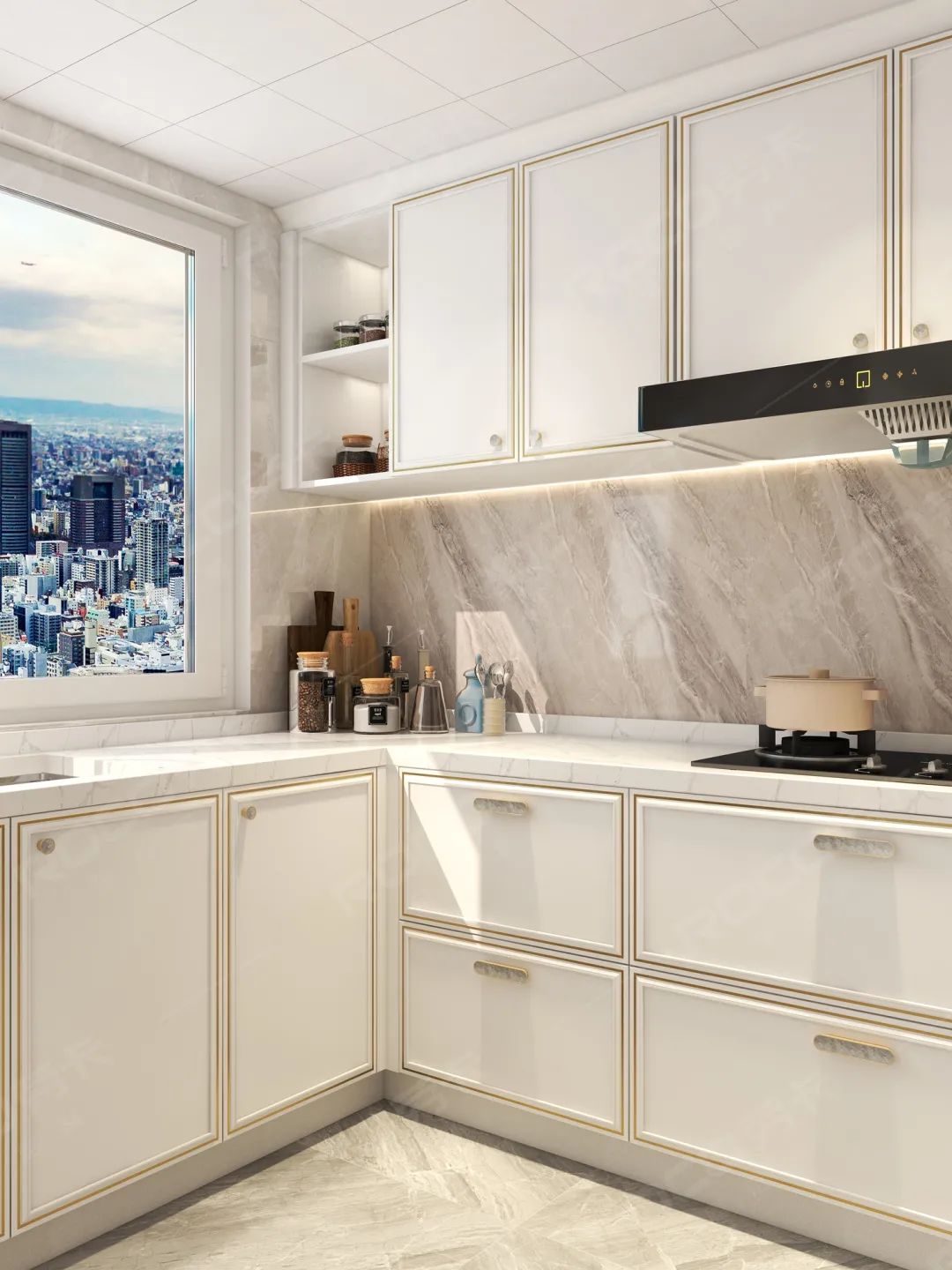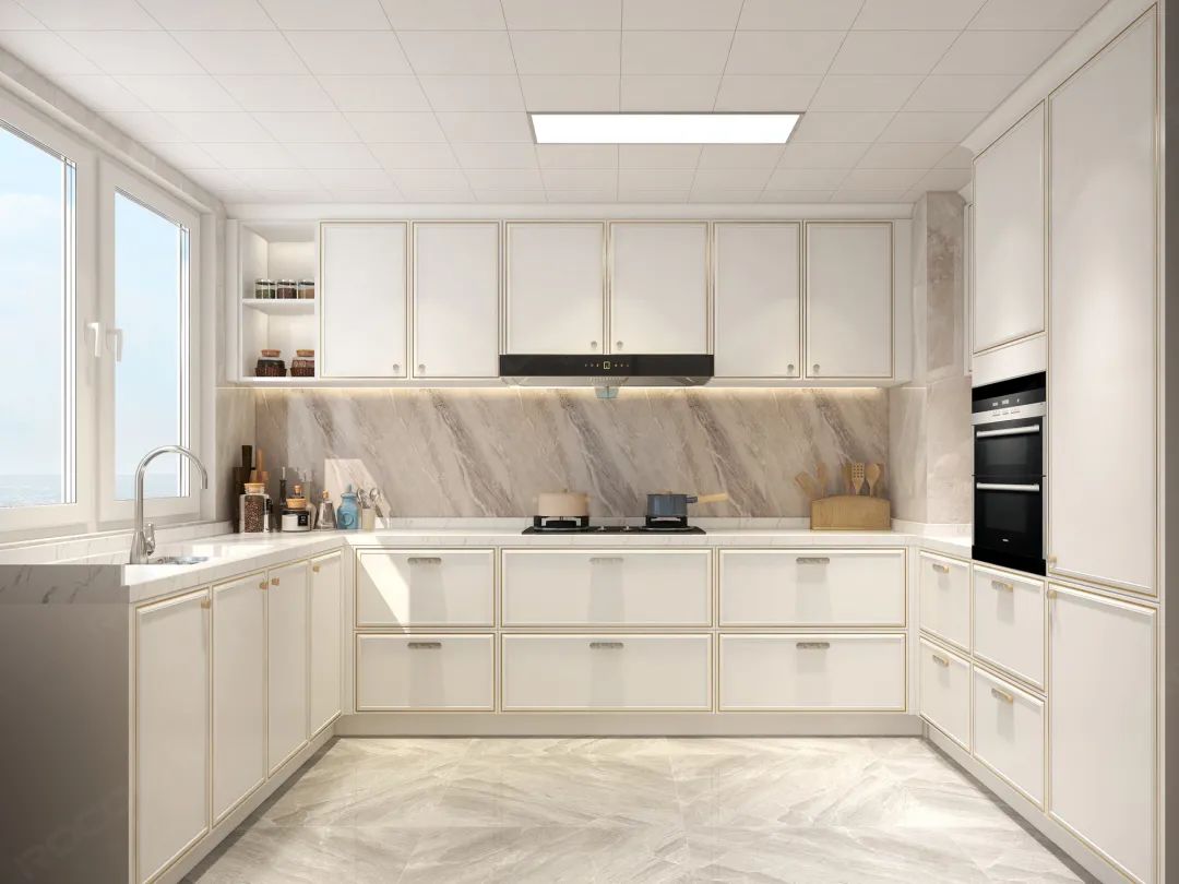 厨房整体色系采用珍珠白,中部留空的料理台墙壁设计采用展现个性的大理石纹理,营造不同的层次感和空间感。
