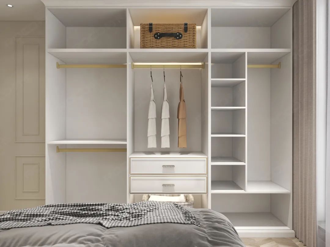 衣柜还是选择到顶设计,平时朋友到访留宿的时候也能有足够的储物空间,到后期父母要搬过来一起居住的话也能完美满足需求。