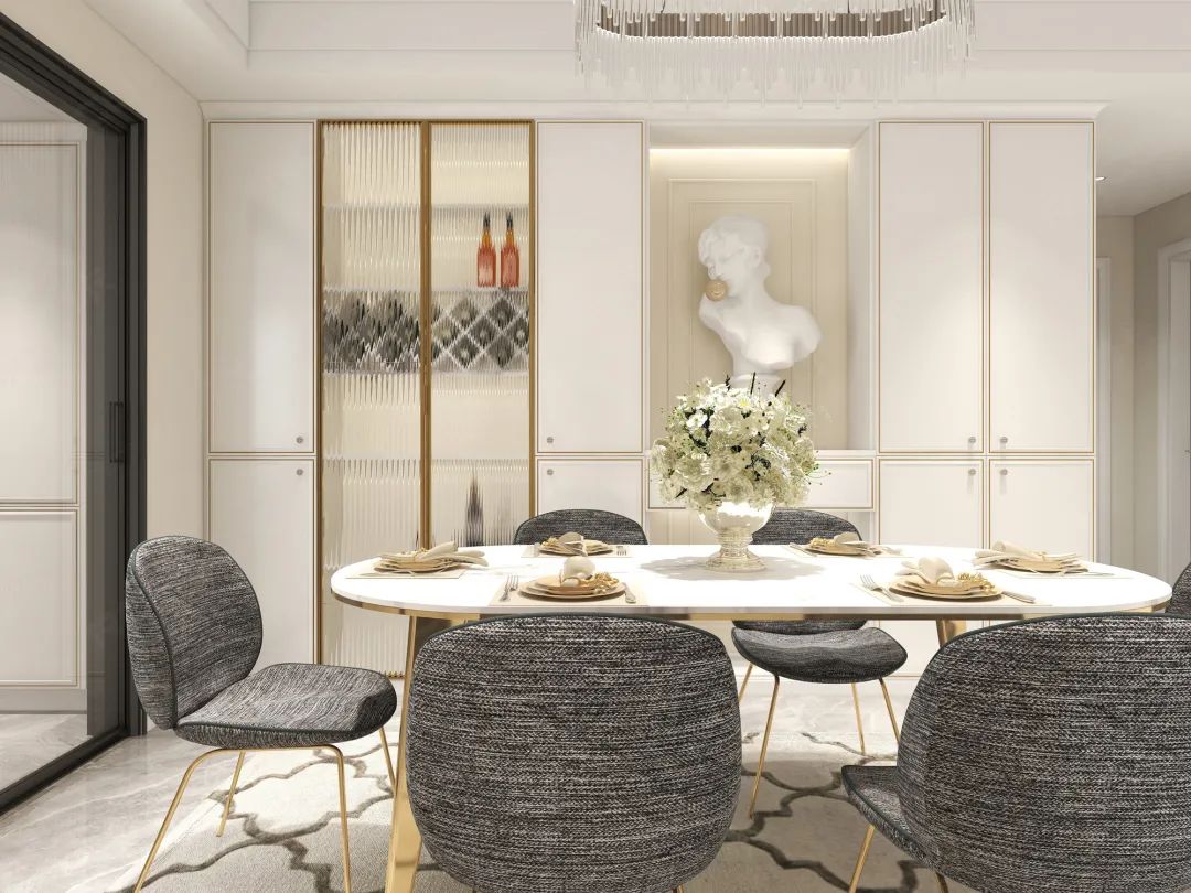 在餐厅一边,@嘉悦最喜欢的酒柜安排到了这里,搭配定制的餐边柜,无缝嵌入墙体,不仅有效利用墙体,提高空间利用率,也使餐厅空间更为宽敞。