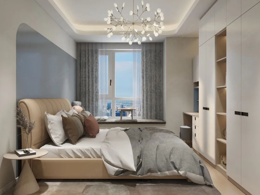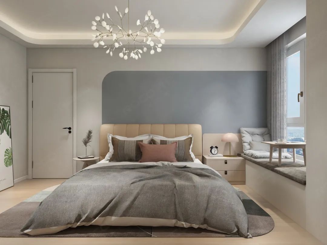 在温柔洁净的白色系的基础下,床头背景墙加入蓝色色彩点缀,极大提高视觉冲击力,让房间自带舒适性同时不失时尚性。