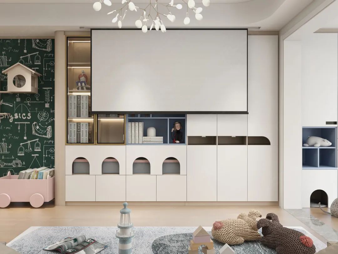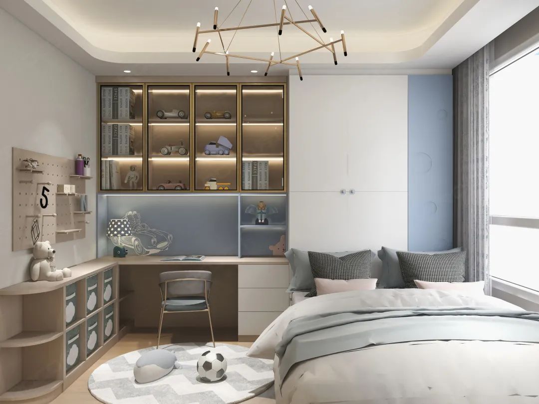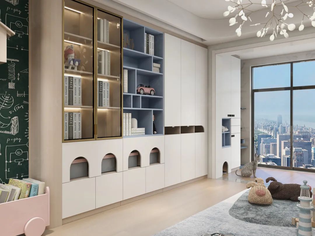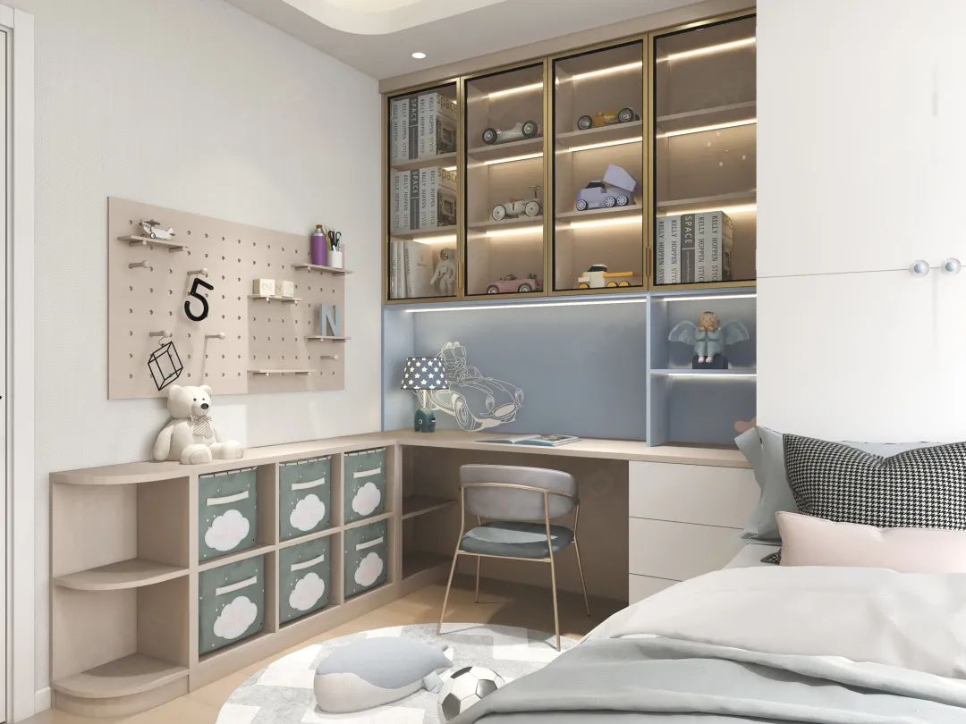 大量的展示空间设计,孩子还幼小的时候:摆放玩具,从小培养收纳的好习惯;孩子长大后:摆上荣誉的奖杯或者得意的作品,增强自信心。