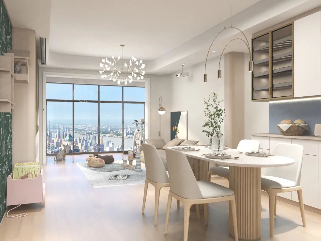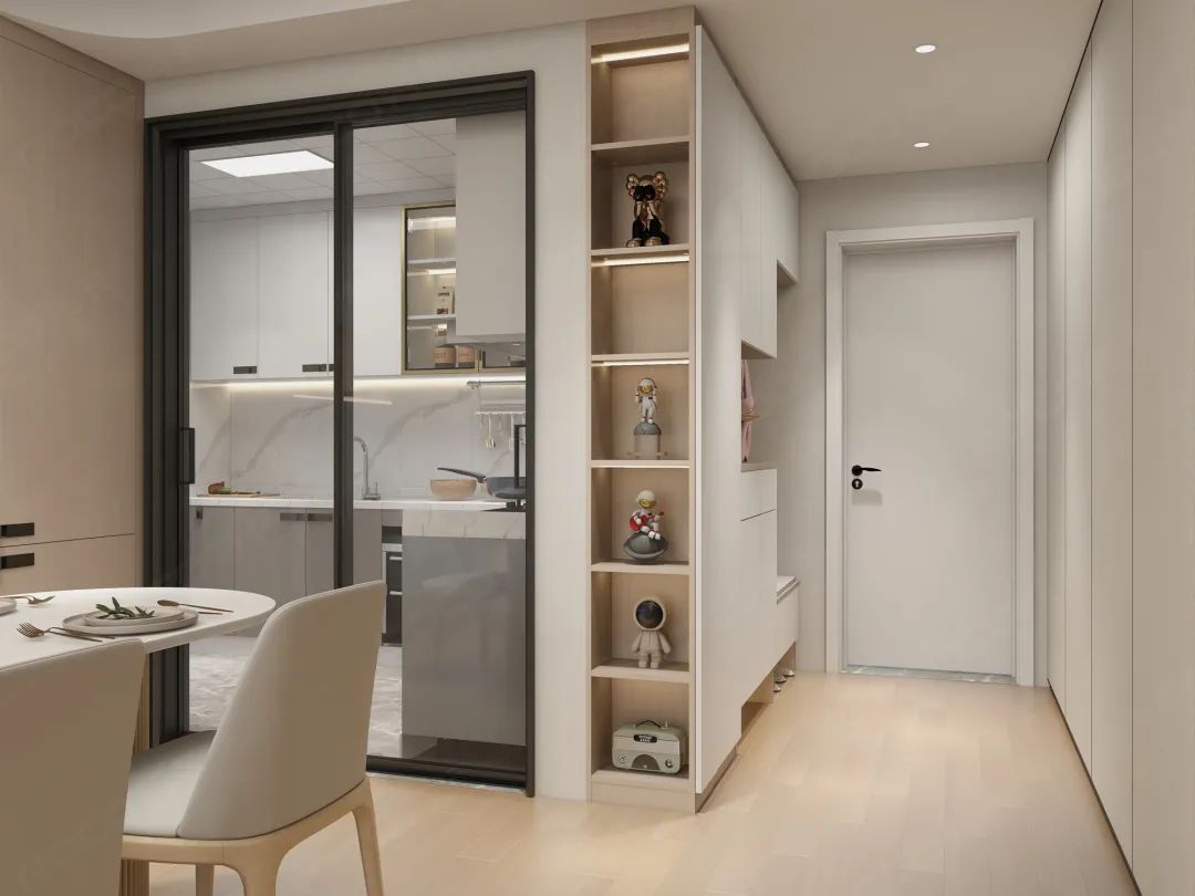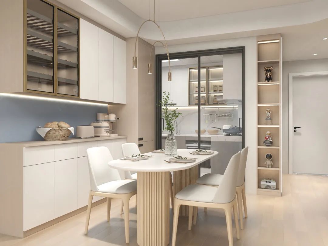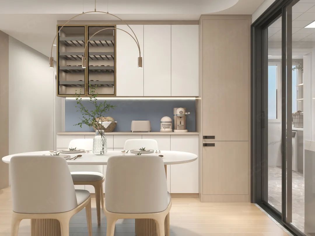 餐厅这边设计通顶的餐边柜,中部留空+玻璃掩门的搭配设计,不仅有拉伸空间的效果,还能提升设计感。