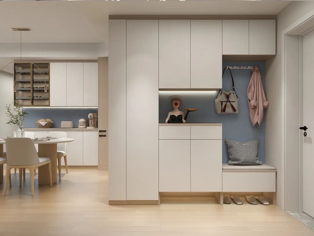 封闭式柜体收纳不常穿的换季鞋子,中部留空于放置包包、钥匙等小物品,继续往下设计换鞋凳,还搭配安装挂衣钩。玄关柜错落的设计,灵动简约实用。