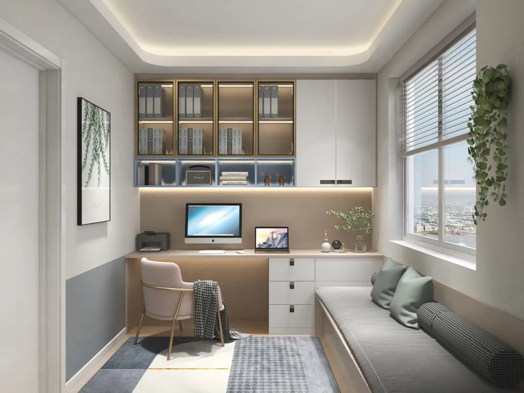 书桌上方的半开放式吊柜满足收纳与展示作用,平时@嘉乐工作累了,就近躺在坐榻上休息,眺望正在晾衣服的妻子,设计十分贴心。