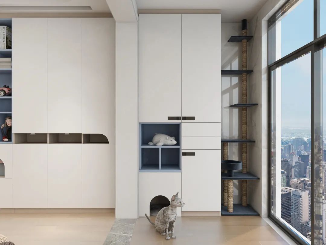 打通阳台设计柜体并把这里打造成萌宠的生活区域,既减轻了客厅收纳压力,又营造清爽整洁的氛围。