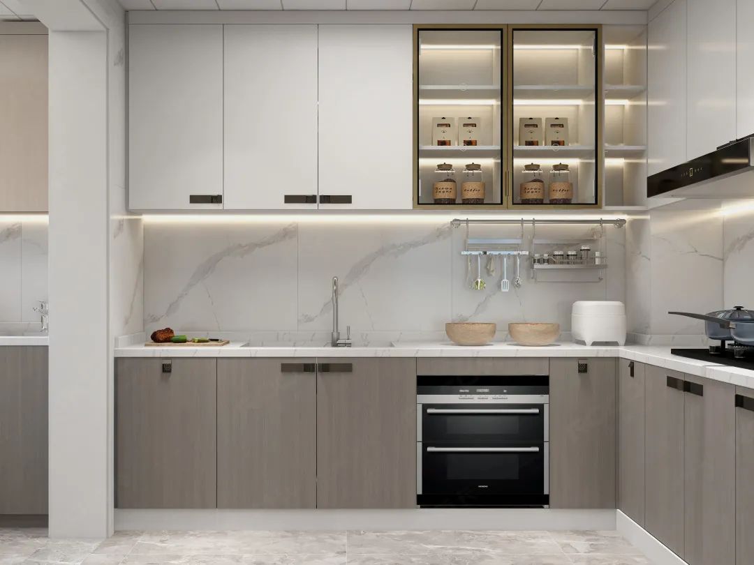 因户型限制,且考虑到收纳需求,厨房采用L型布局上方吊柜安装玻璃掩门,摆放调料瓶罐清晰可见,方便随放随取。