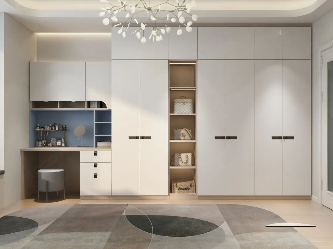 在床尾打造梳妆柜与衣柜一体设计,既满足生活起居使用又便捷拿取,让空间显得纯粹而又不失温情。